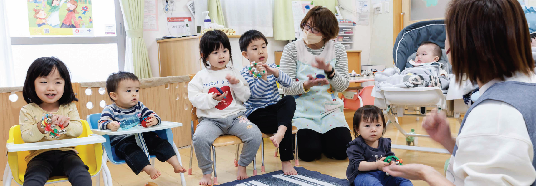 医療生協かわち野生活協同組合、社会福祉法人かわち野福祉会及び一般社団法人大阪ファインの職員(職種に関係なく)の子どもであり、産休明け(3ヵ月)から小学校就学前までの乳幼児を対象とします。但し、満3歳以上の幼児に関しては、認可保育園への申請手続きを取っていること(やむを得ない事情により申請が出来ない場合は別途相談に応じる)。